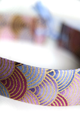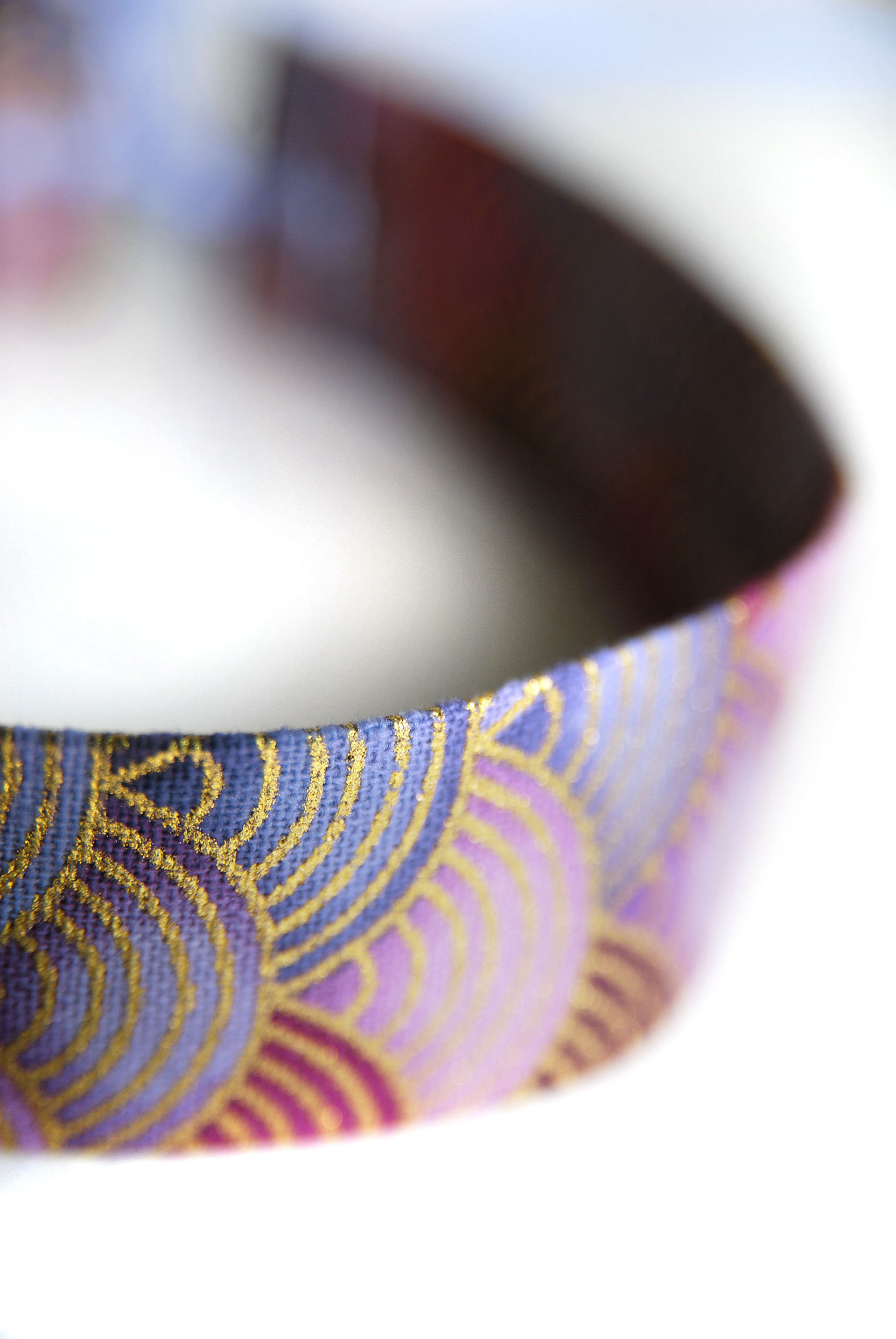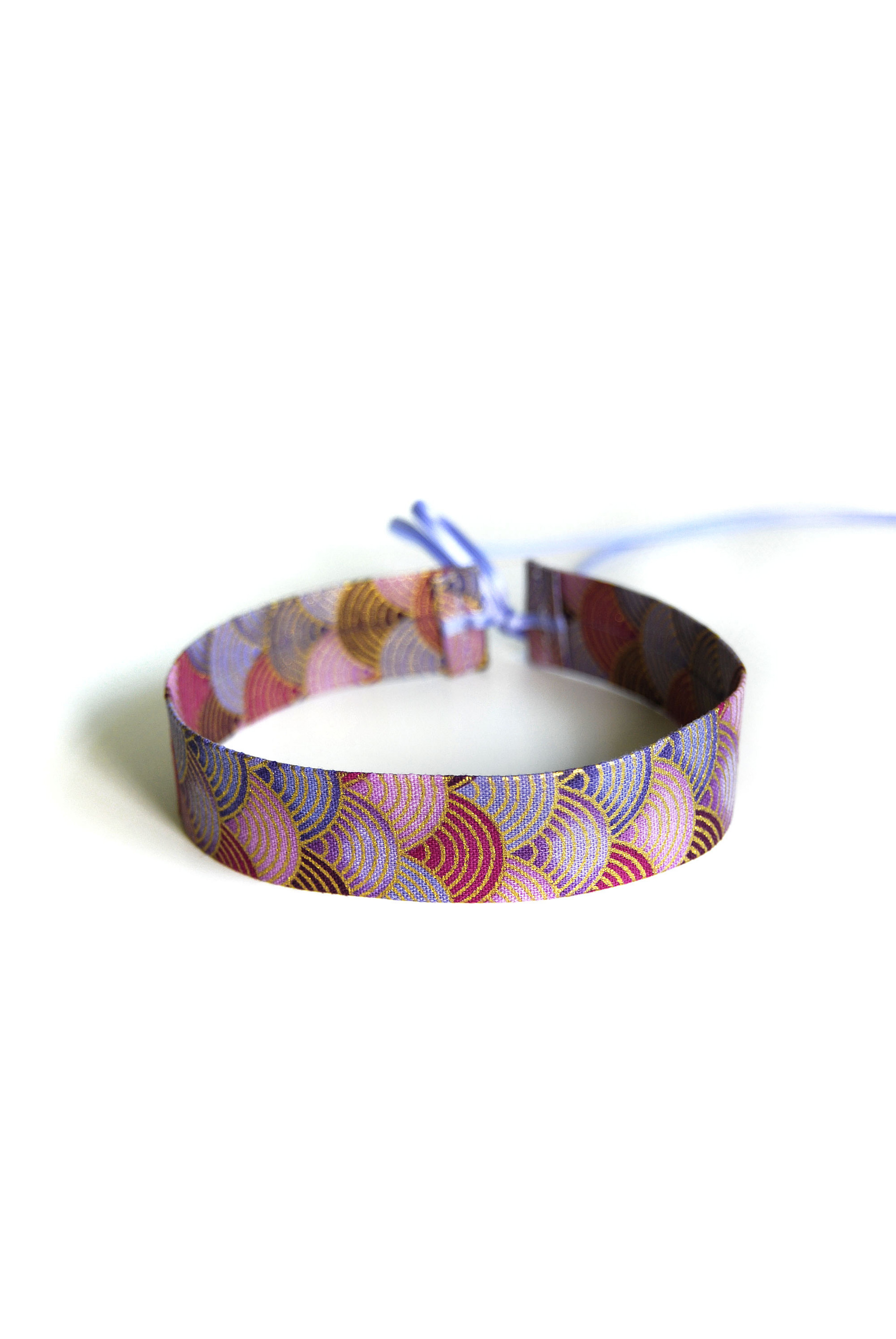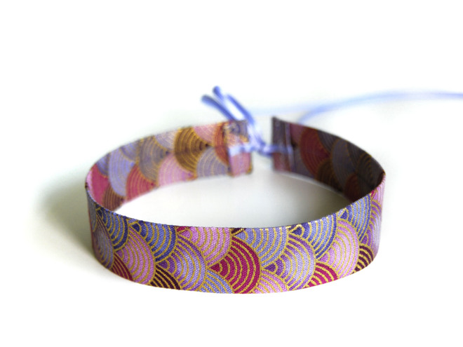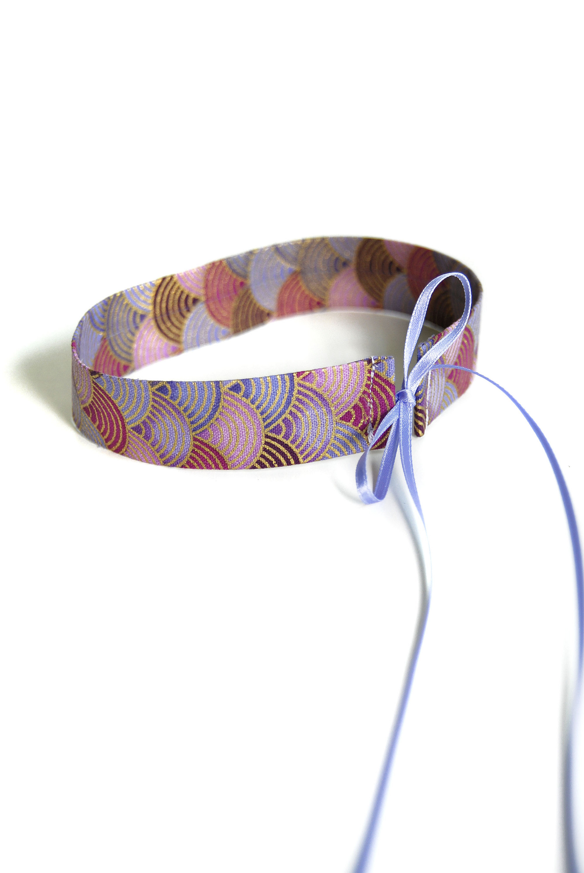Collana girocollo larga 2,5 cm in varie tonalità di viola/bordeaux con stampa a fiocco color oro e stretti nastri di raso double face per annodare