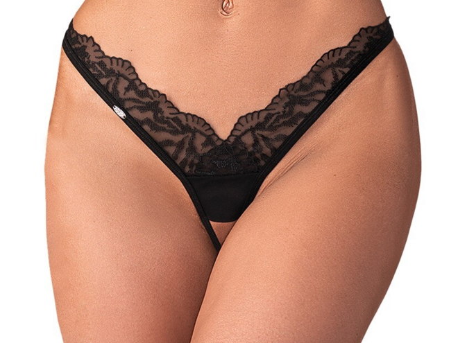 Splendido perizoma crotchless Arrowel di Obsessive in tulle nero trasparente con pizzo sottile sul davanti. Morbido ed elastico per un alto livello di comfort. Invitante apertura sul cavallo.