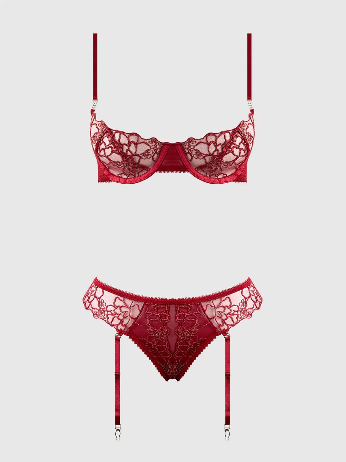 Lasciati conquistare dal fascino seducente del set Eden con reggiseno in pizzo ricamato e slip a vita bassa senza schienale. Questo duo è composto da un reggiseno a mezza coppa con ferretto e scintillanti ricami in lurex e da uno slip a vita bassa con schiena scoperta per un look audace. Perfetto per esaltare le tue sensuali serate romantiche.