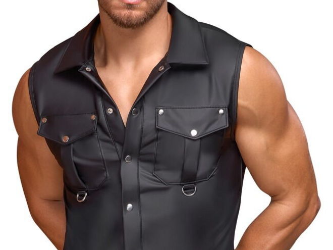 Camicia senza maniche di NEK dal taglio aderente al corpo, con abbottonatura anteriore con bottoni a pressione su tutta la lunghezza. In un look nero opaco di tendenza. Leggermente elasticizzata per una vestibilità aderente e confortevole. Due tasche sul petto applicate con anelli a D.