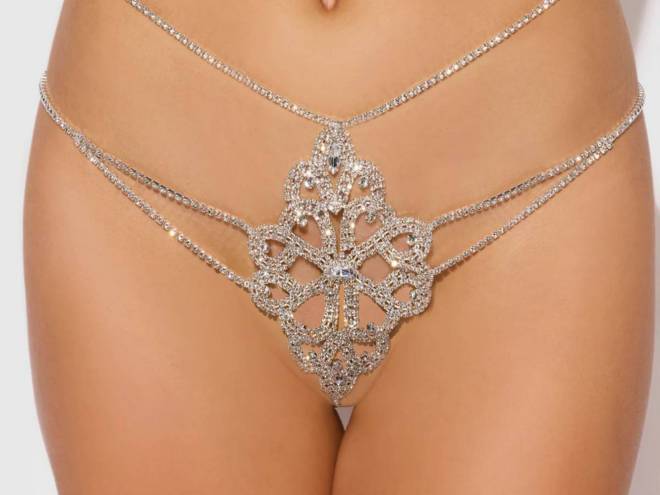 Questo slip con nodo a spirale e strass incornicia i fianchi come un'opera d'arte, con spalline scintillanti e un vortice centrale che attira l'attenzione sui tuoi punti più dolci. Pietre di diverse dimensioni decorano il centrotavola per un design scolpito, mentre le spalline sinuose si sovrappongono alle tue curve.