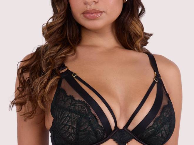 Osate affascinare con il reggiseno scollato in pizzo effetto bagnato "Tabitha" verde scuro: un'accattivante fusione di pizzo effetto bagnato, con laccetti e dettagli di imbracatura utility e lussuosi dettagli dorati. Questo reggiseno non è solo lingerie; è un capo indimenticabile che vi farà sentire audaci e sicure di voi stesse.