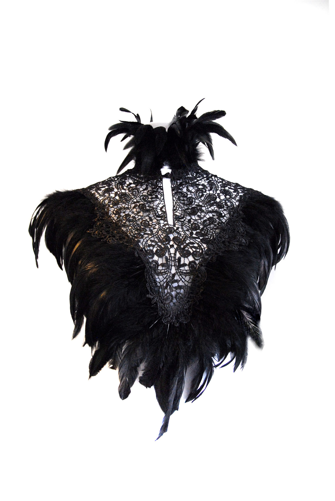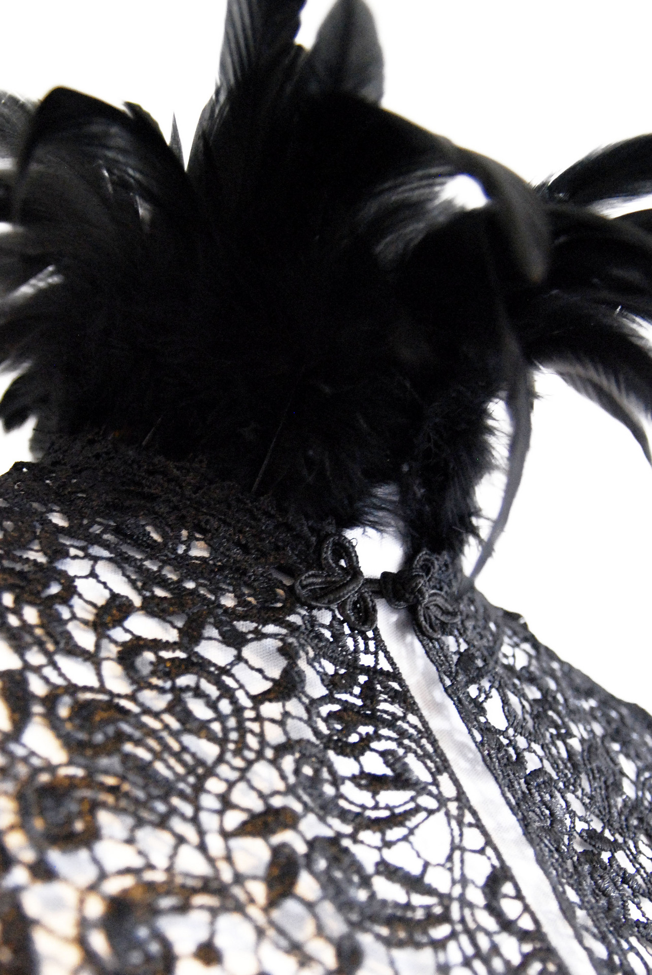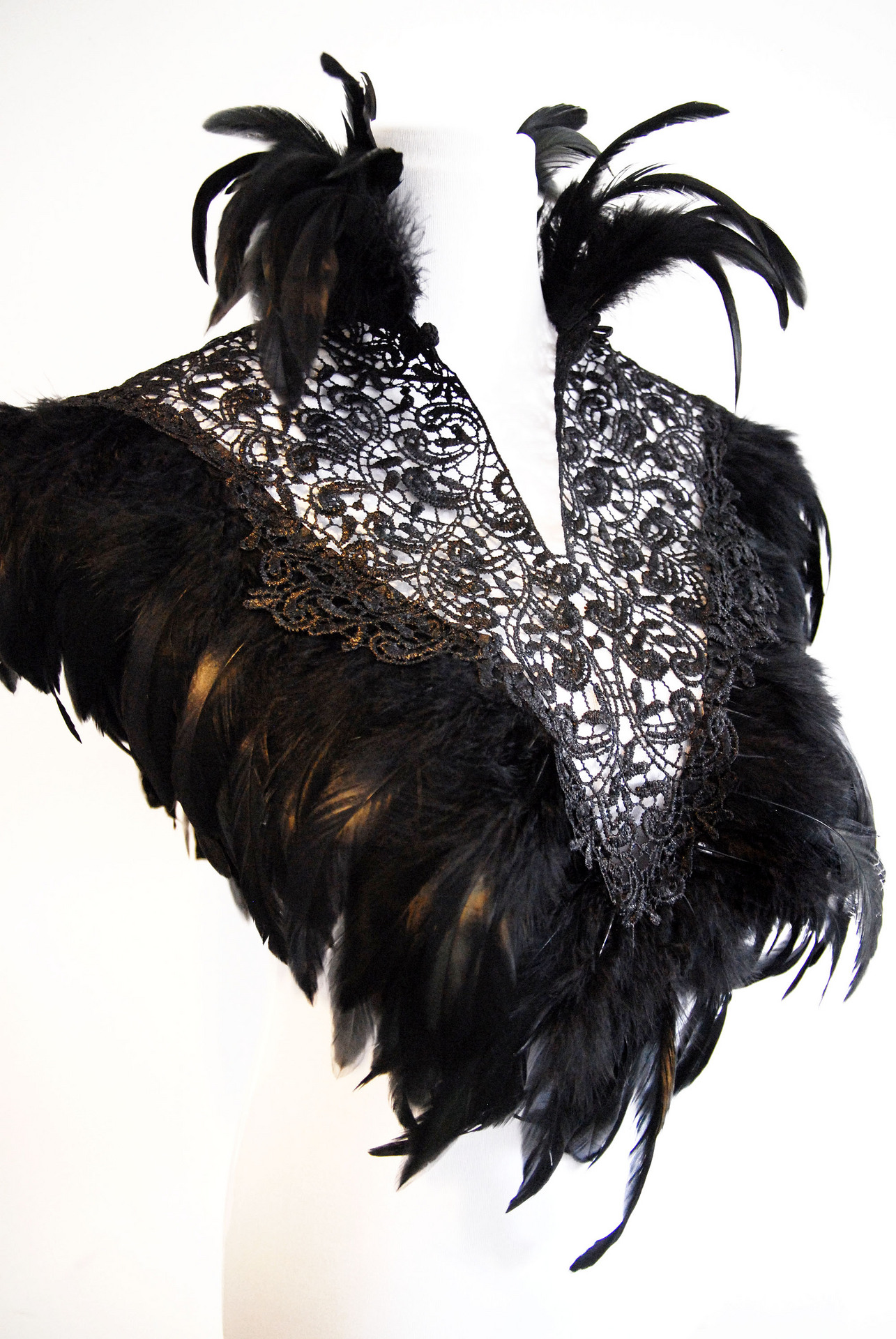 Cappa in pizzo macramè dalla forma triangolare e apertura sul collo con bottoncino, bordata con piume di gallo