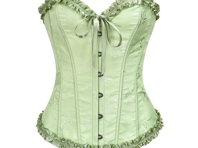 Questo corsetto overbust vintage verde erba è caratterizzato da uno squisito tessuto jacquard, finiture arricciate su seno e orlo, un fiocco, stecche di plastica integrate per un supporto extra, chiusura anteriore con busk per indossarlo facilmente, allacciatura posteriore per stringere, perizoma abbinato.
