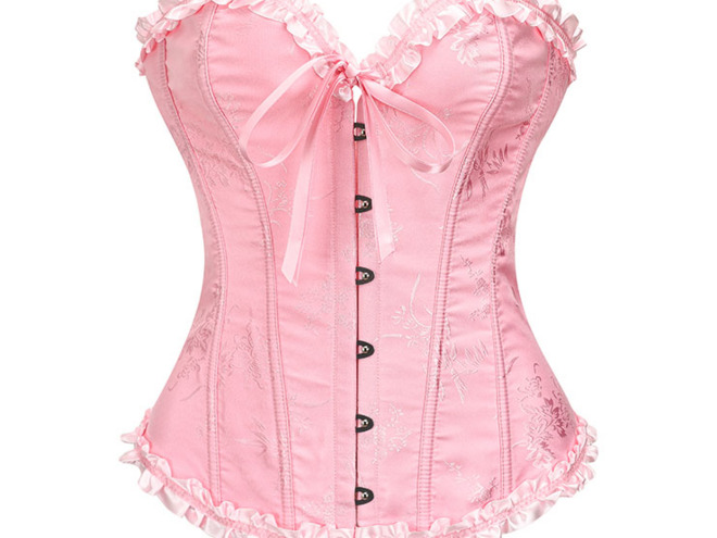 Questo corsetto overbust rosa vintage è caratterizzato da uno squisito tessuto jacquard, finiture arricciate su seno e orlo, un fiocco, stecche di plastica integrate per un supporto extra, chiusura anteriore con busk per indossarlo facilmente, allacciatura posteriore per stringere, perizoma abbinato.