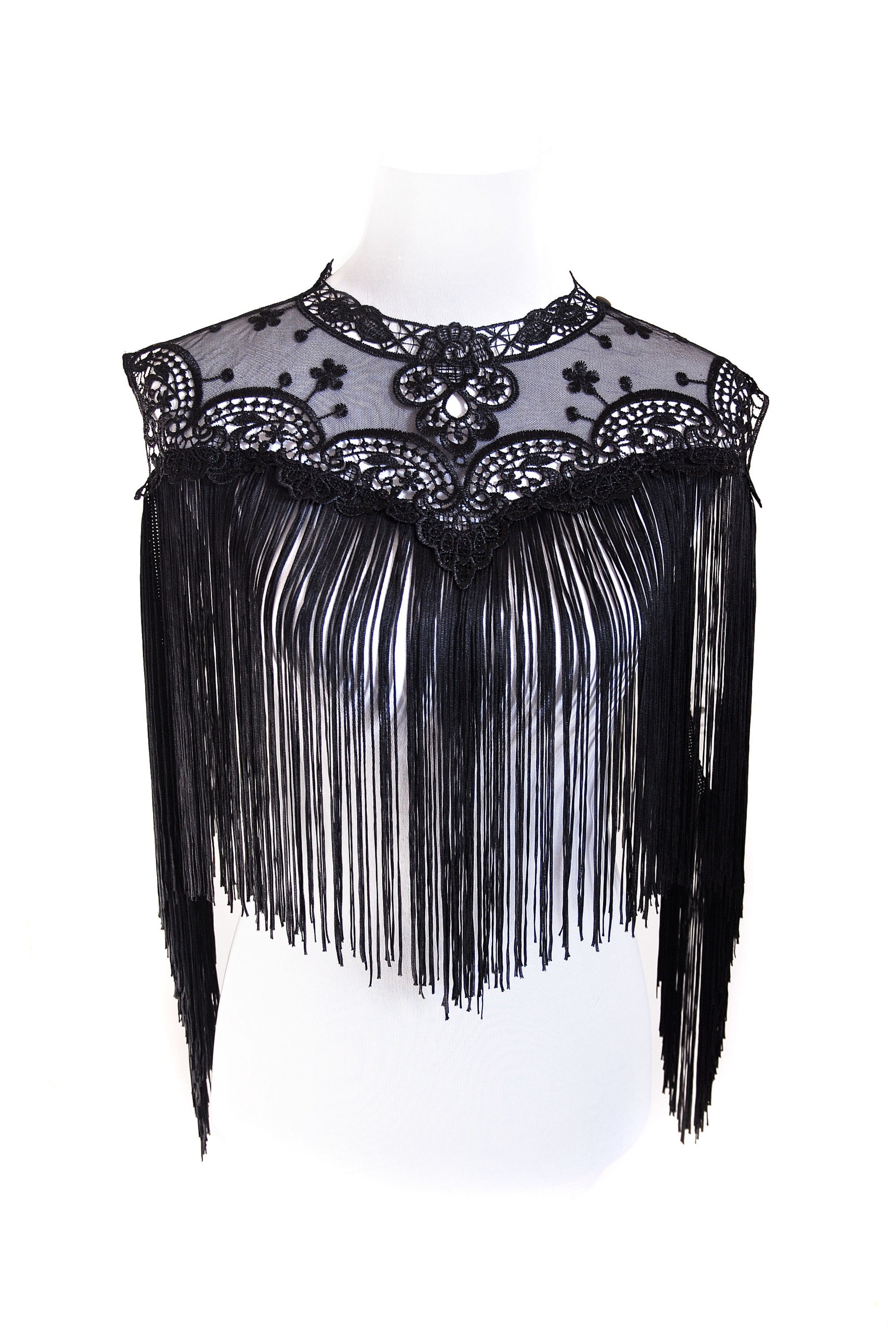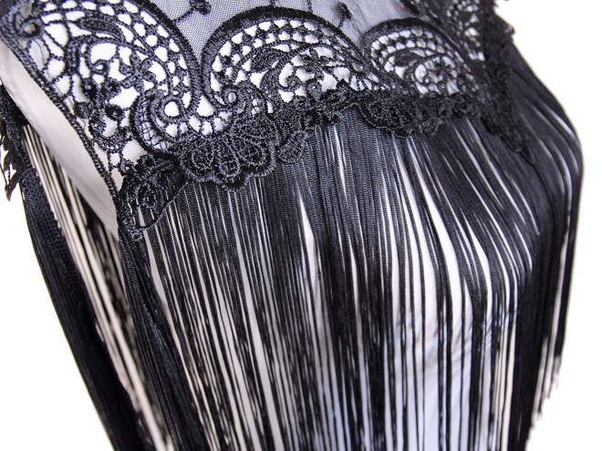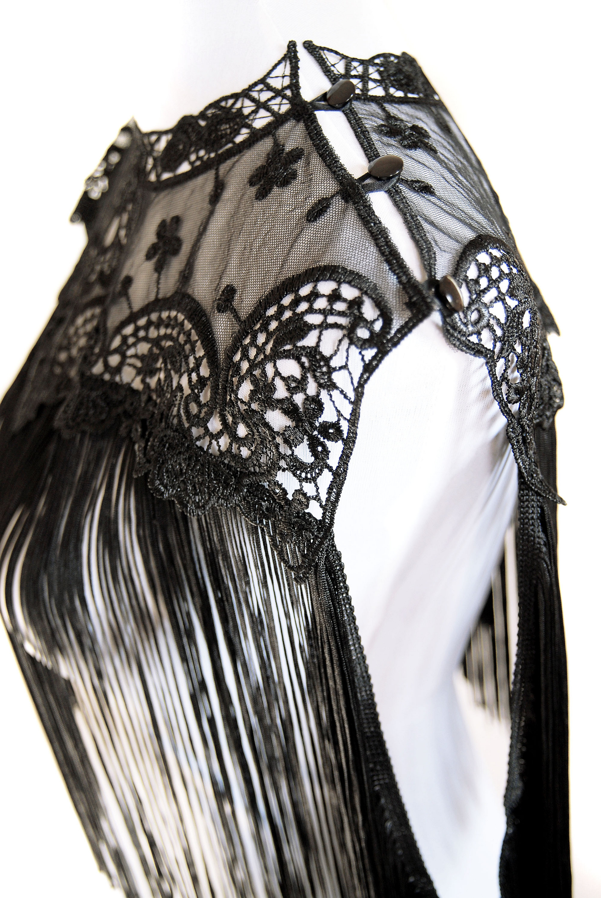 Coprispalle nero in pizzo con frange lunghe 30 cm. Il coprispalle può essere aperto con tre bottoni.